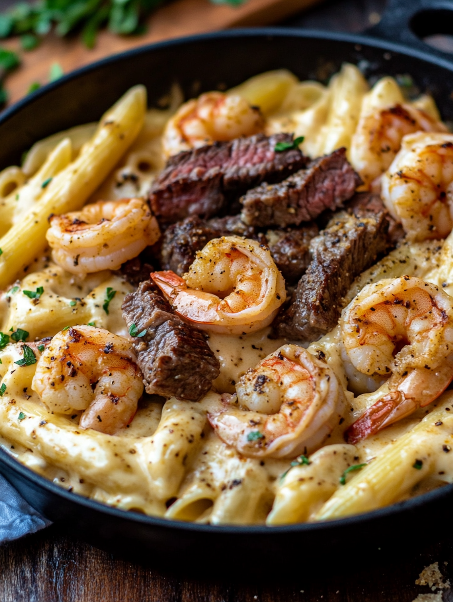 - Serve the Cajun Shrimp and Steak Alfredo pasta hot, garnished with chopped parsley.