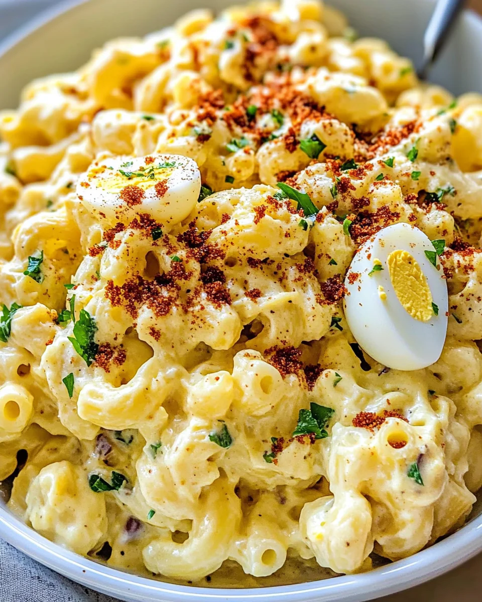 This Creamy Deviled Egg Macaroni Salad is a delicious and unique twist on a classic dish. The creamy and tangy flavors of the deviled eggs complement the traditional macaroni salad ingredients perfectly, making it a crowd-pleaser at any gathering. Whether you’re serving it at a potluck, picnic, or as a side dish for dinner, this recipe is sure to be a hit. Give it a try and enjoy a flavorful and satisfying dish that everyone will love!