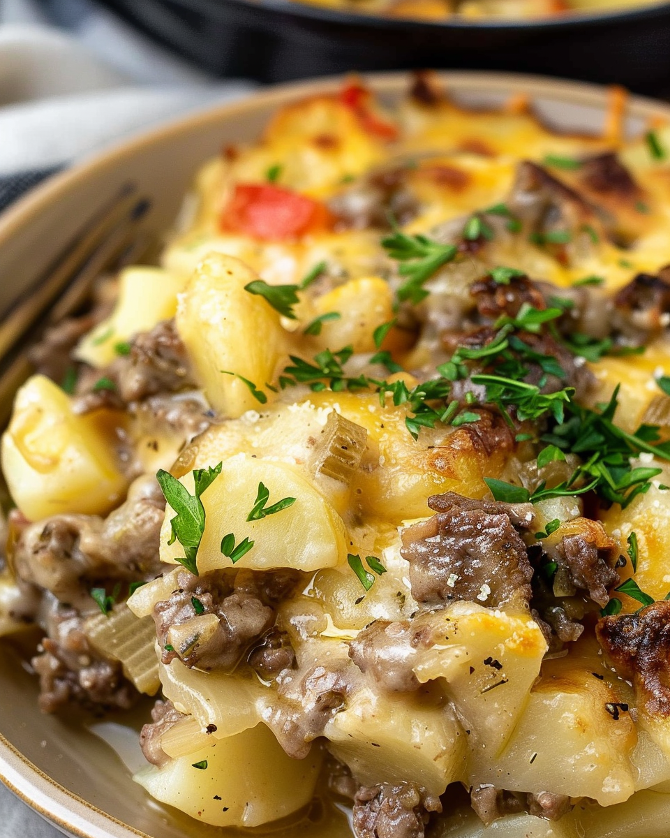 Good heat brings sweetness from onions and browning builds savory depth without bitterness. Salt sharpens flavor while a touch of acid at the end makes everything taste brighter. If the Crockpot Cheesesteak Potato Casserole sauce feels thick, add a splash of liquid; if it feels thin, simmer a minute longer.