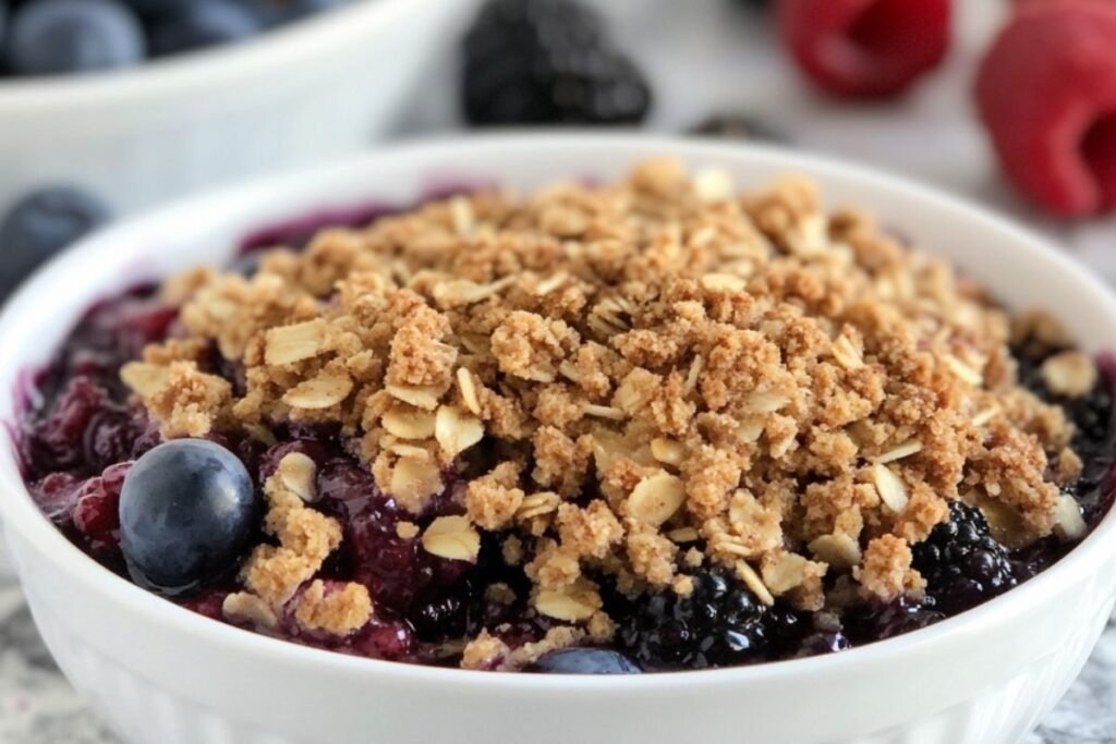 Place the dish in the preheated oven and bake for 35 to 40 minutes. You’ll know it’s done when the topping turns a beautiful golden brown and the berry filling bubbles at the edges.